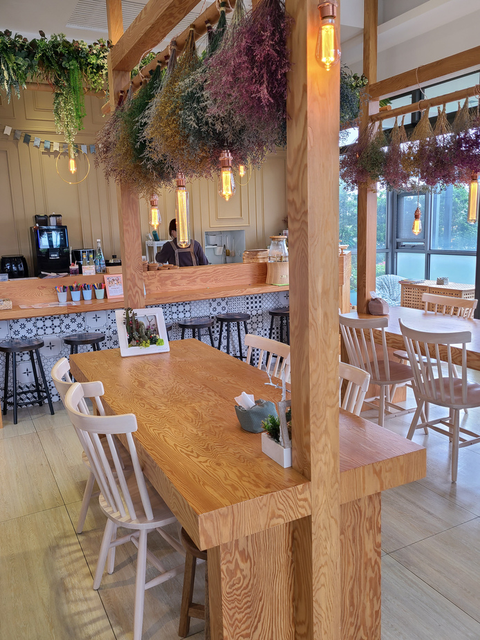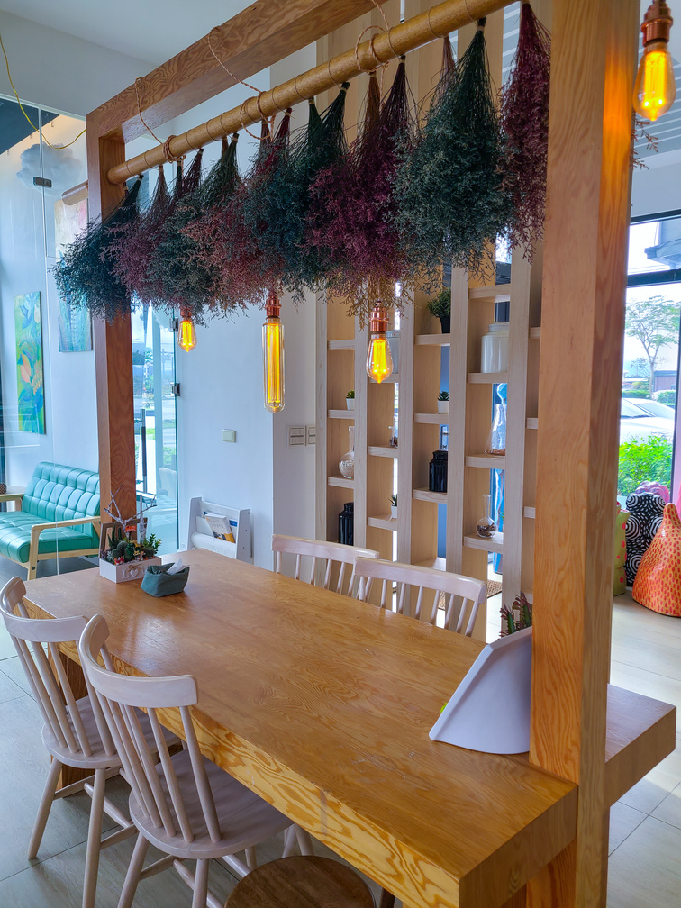 吧台邊原木大餐桌裝飾著乾燥花