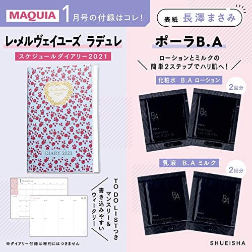 《MAQUIA》本期除了統整高CP值的保養品之外,還會推薦今年度最受矚目的美容家電、不需要花錢的「小臉」按摩技巧及2020年彩妝大賞清單,豐富內容絕對是1月必須收的一本。而附錄也是相當闊氣,直接送出「Les Merveilleuses LADUREE 2021年手帳」和「POLA B.A試用包組(乳液、化妝水)」,手帳的小碎花封面看了心情都愉悅起來了!