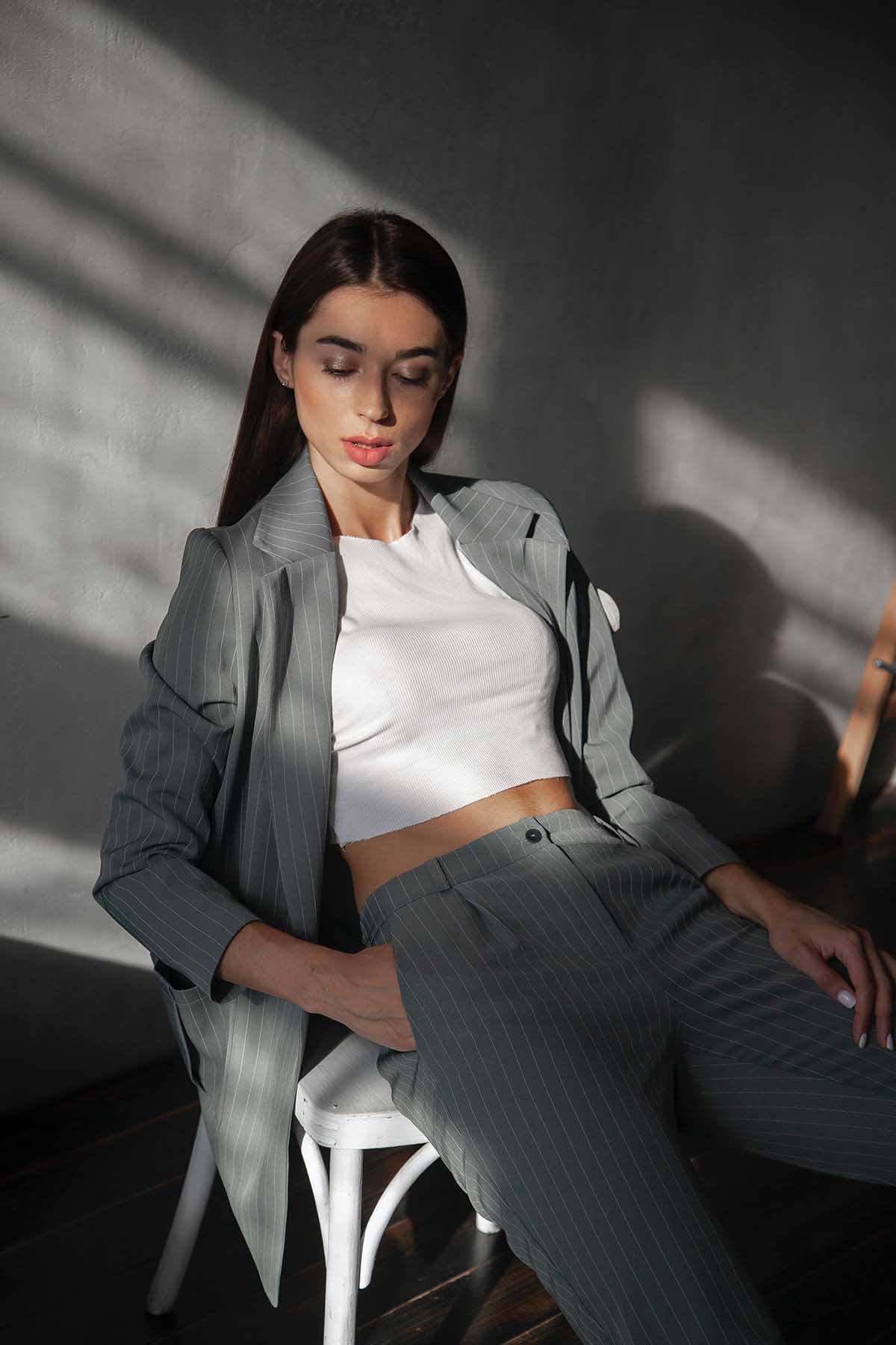 長版西裝外套搭配成套西裝褲裝,再結合中性色,使造型更具整體性、乾淨整潔,同時保留了一些女性典雅的特質。是正式場合非常安全、適合的選擇。