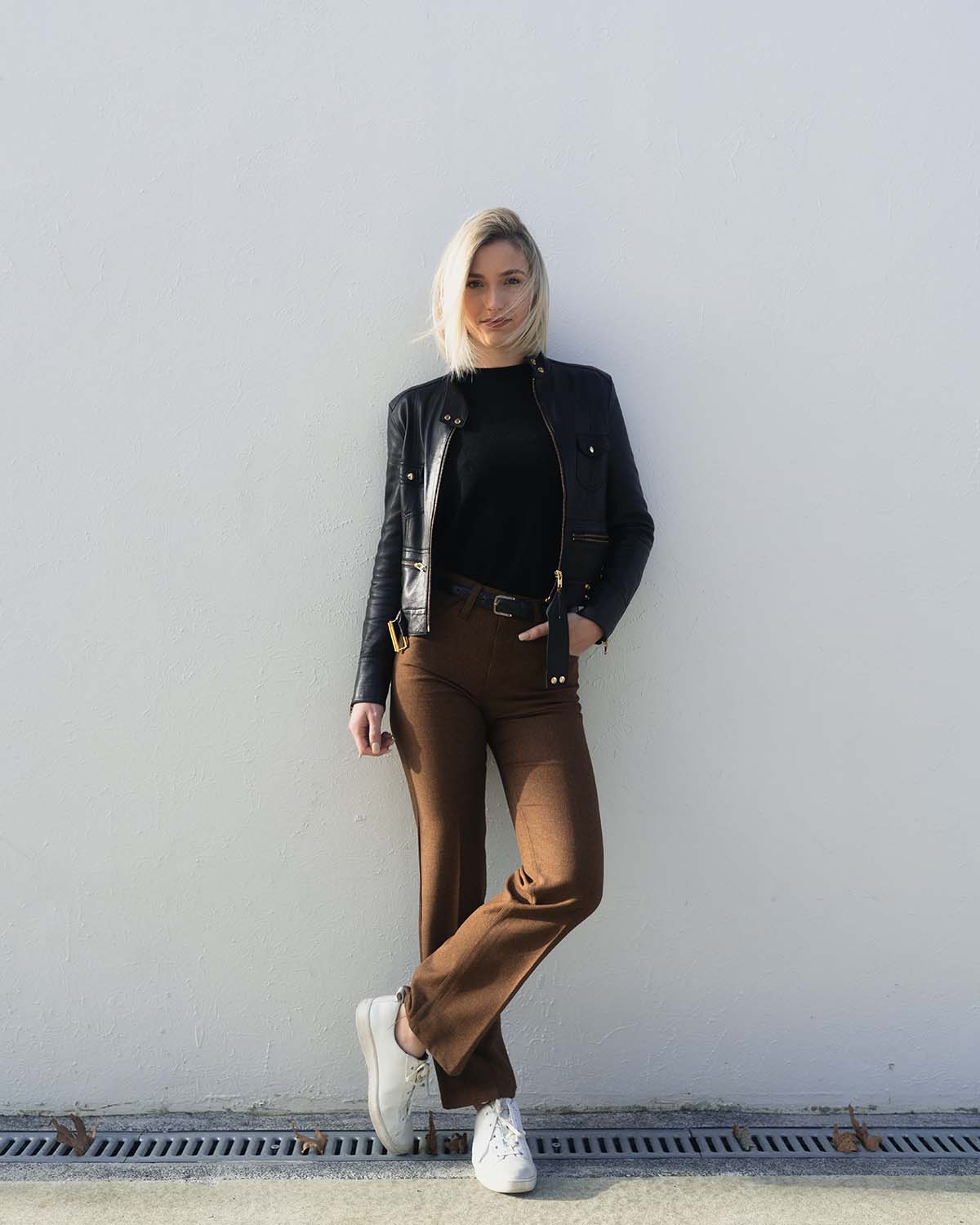 同樣經典的黑皮革外套能將叛逆不羈的元素加入穿搭使其變得更中性,套上視覺效果顯著的皮革材質立刻吸引眾人目光。