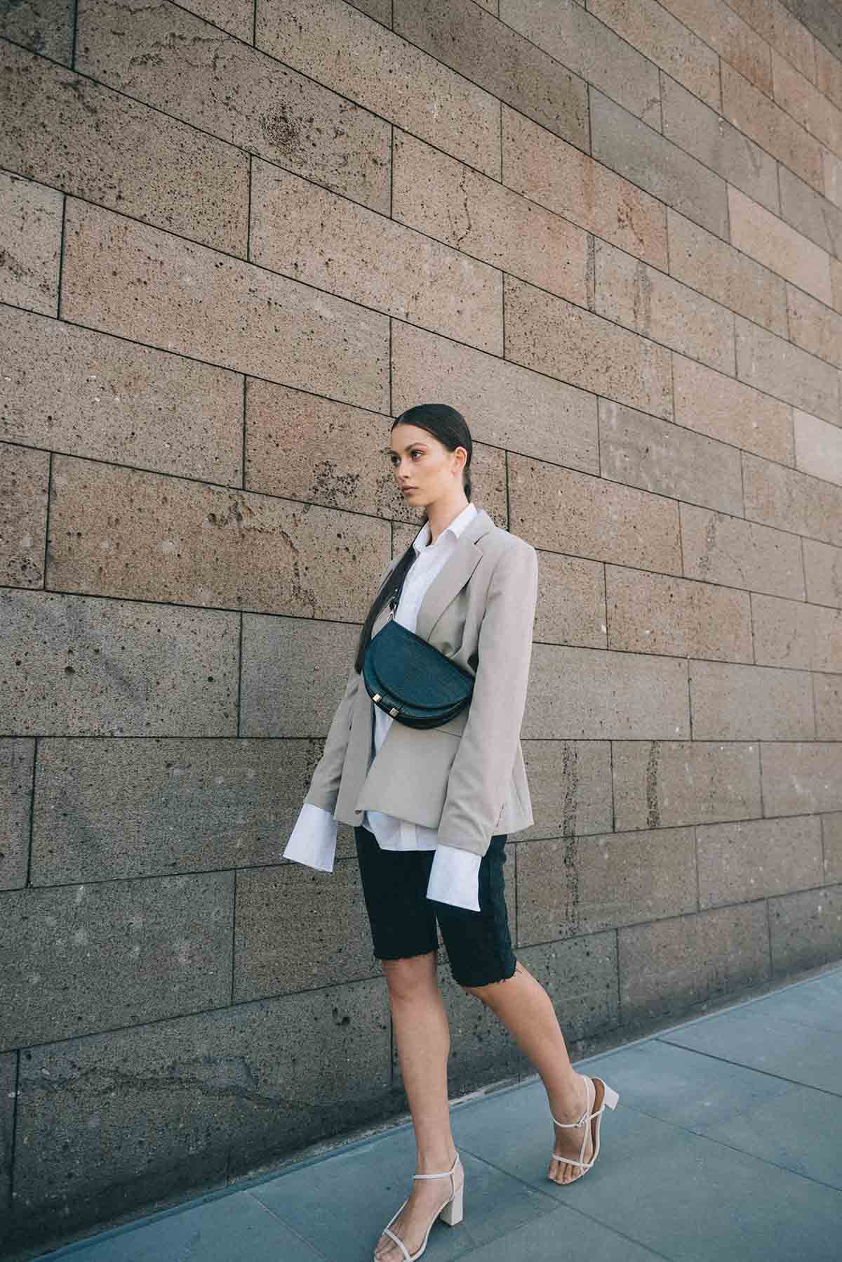 中性色顧名思義也會帶給人視覺上的中性效果,是本篇的大重點之一!而利用挺版襯衫創造出微硬派的氣場,可營造出俐落幹練的氛圍。