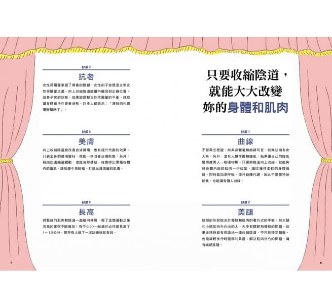 就算不是為了減肥,為了健康也很推薦!腰痛、經前症候群、漏尿、內臟下垂、便祕…5大女性常見的問題都能靠「收縮陰道」改善,而且沒有場地、時間限制,不管你在做什麼,都能默默進行(笑),書中循序漸進示範教學,一步步改善你身體的肌肉,不管是小腹、大腿肉、下垂屁股、甚至大餅臉,從內到外瘦起來!