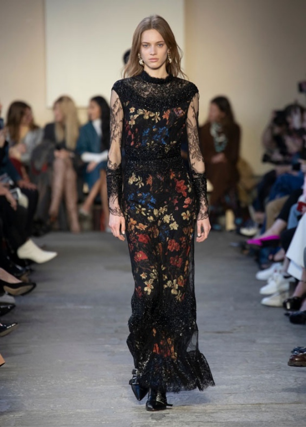 Chloé將黑色蕾絲製作成整件外套,但如果沒穿好,很容易讓外套看起來很有睡衣感,因此品牌用桃紅色的背心洋裝搭配棕色長靴搭配,使造型更鮮明,看起來非常有型!