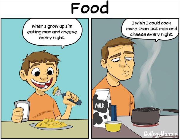 小時候總是好想趕快長大,成為不受家長、學校約束的大人;長大成人後,又常常希望可以回到連煩惱都很單純的年少時光。究竟我們在跨越「長大」這條線的瞬間,發生了什麼轉變?國外網站CollegeHumor對此有感而發,發布了一系列漫畫,一秒對照兒時與成年後對於同一件事竟有完全相反的立場,一路走來幻滅如一的你,還不來看看嗎?