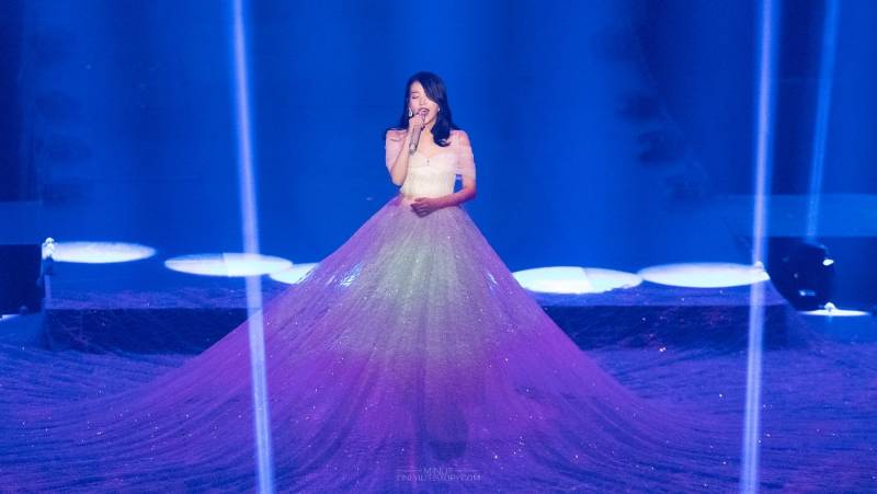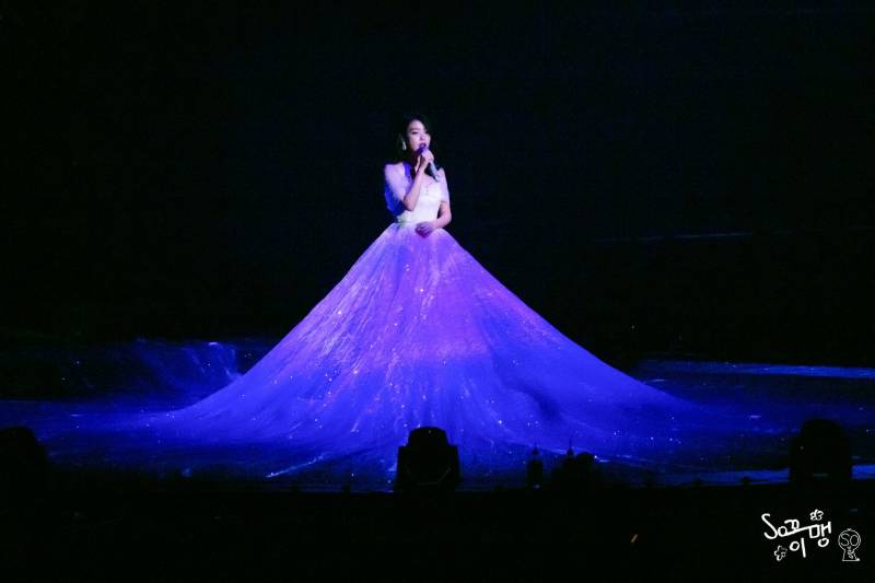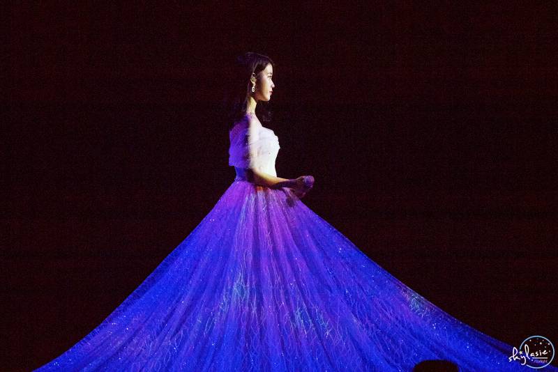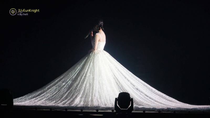 在演唱會下一個環節的舞台開始前,一片黑暗的會場之中,IU穿著一席足以填滿整個舞台的「超巨白紗禮服」在鎂光燈下華麗登場!存在感十足的夢幻裙擺,讓IU就像下凡的天使,仙氣、氣場都直破天際~
