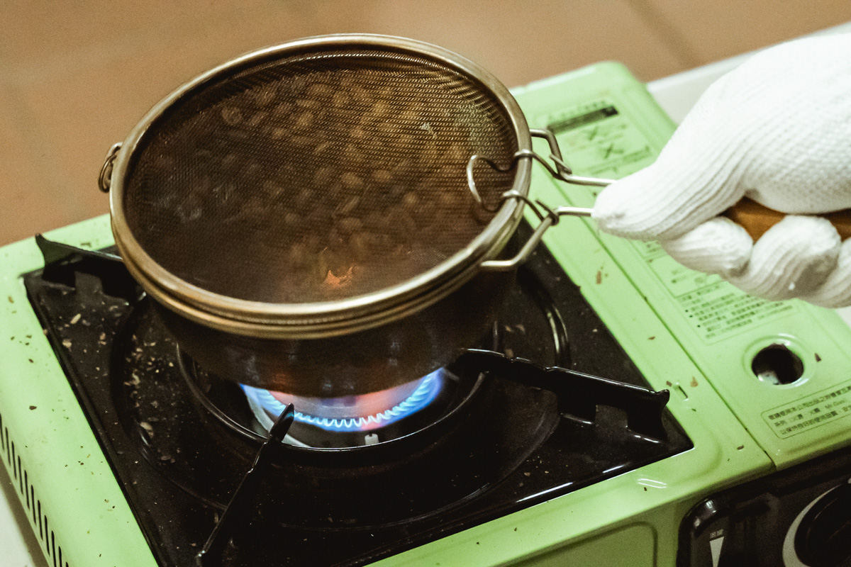 接下來進行到DIY烘豆的過程,將上圖的生豆放入特殊的烤網,經過卡式爐的烘培,就能將青綠色的咖啡生豆烘成市面上看到的咖啡色豆子。「如果聽到『逼逼啵啵』,類似爆米花的聲音,就代表差不多完成了。」咖啡豆的淺、中、深焙就是依照這些爆裂聲喔!