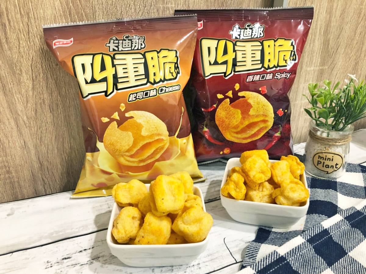 「卡廸那四重脆」系列新品,將於3月起於全台各大通路強勢登場,首波上市推出起司及香辣兩種人氣口味。起司口味以香濃的切達起司搭配玉米胚體,讓風味更具有層次; 香辣口味由研發團隊精心調製的秘製配方,微辣帶勁,一吃就上癮。相信「卡廸那四重脆」將會在台灣休閒零食市場上,造成熱烈的迴響及關注。