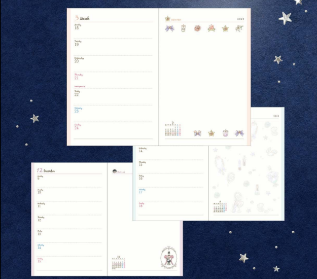粉紅款跟紅色款的風格截然不同,這一個款式走的是可愛的插畫風,在月記事、週記事欄位以經典的飾品、化妝品、變身器等元素為背景圖案。