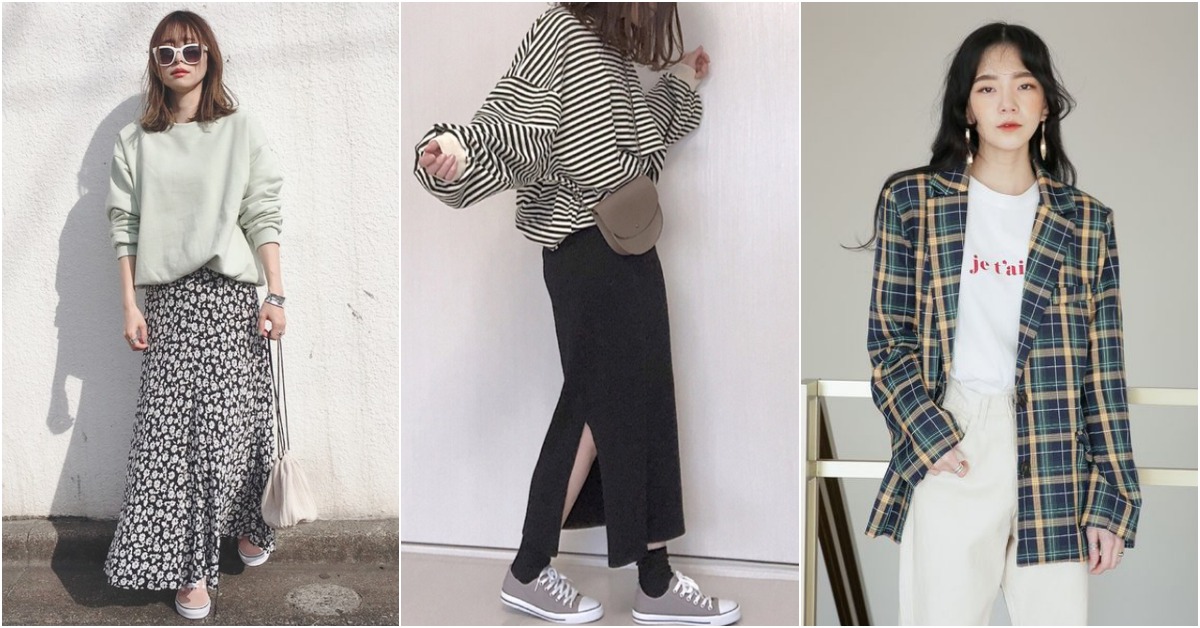 妞編輯一直很想購入這種寬鬆的條紋上衣,超級百搭!下半身配上緊身長裙,踩上Coverse休閒鞋就能出門約會了~