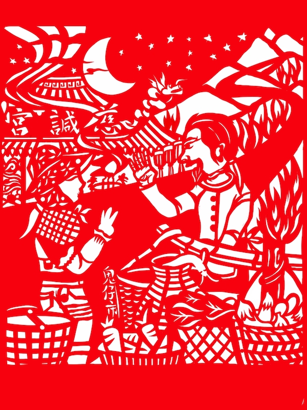 作品中的圖像,正是農人挑著扁擔、提著火把來到慈諴宮前,與客人喊價的景象。