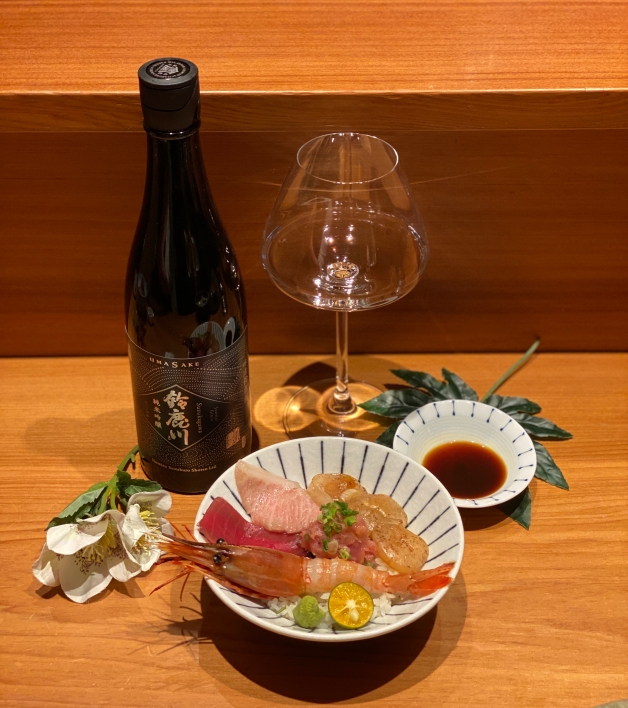 季節限定的「日本極上黑鮪丼」,放入的有黑鮪魚的大腹和中腹、北海道馬糞海膽、魚卵和紫蘇葉,佐的是三重縣清水清三郎酒造「風之舞藤 純米吟釀」,這款帶點果實般的香氣,穩重且優雅,和赤身達到絕佳的平衡感!
