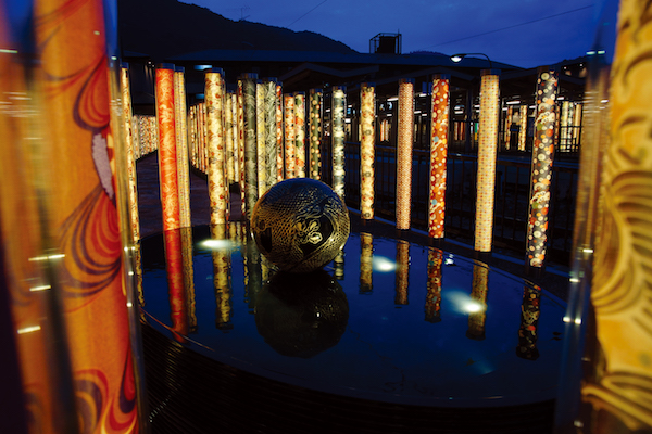 不只白天的景色壯觀,到了夜晚還有夢幻點燈。在圓柱內接裝的LED燈,會在太陽西下後全部點亮,讓嵐山站籠罩在浪漫光芒之下。而沿著「友禪的光林」小徑走下去,還可看到以天龍寺的「龍」作為車站守護神的「龍之愛宕池」喔!據說向降臨嵐山的龍許願,願望就會成真。大家不妨在旅行歸途好好祈願、作為美好句點吧!