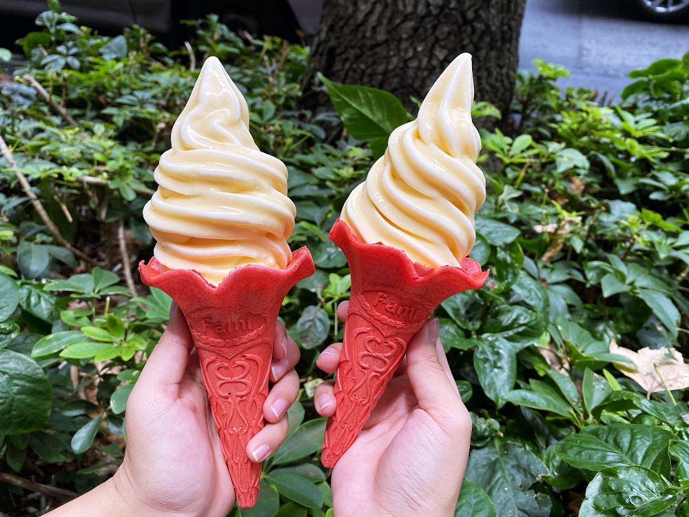 「青森蘋果霜淇淋」以紅色餅皮搭配黃色雪酪,外型走可愛的馬卡龍色調,味道酸酸甜甜帶著蘋果的清香,吃起來消暑解膩,一次滿足視覺與味覺,夏日必嚐!