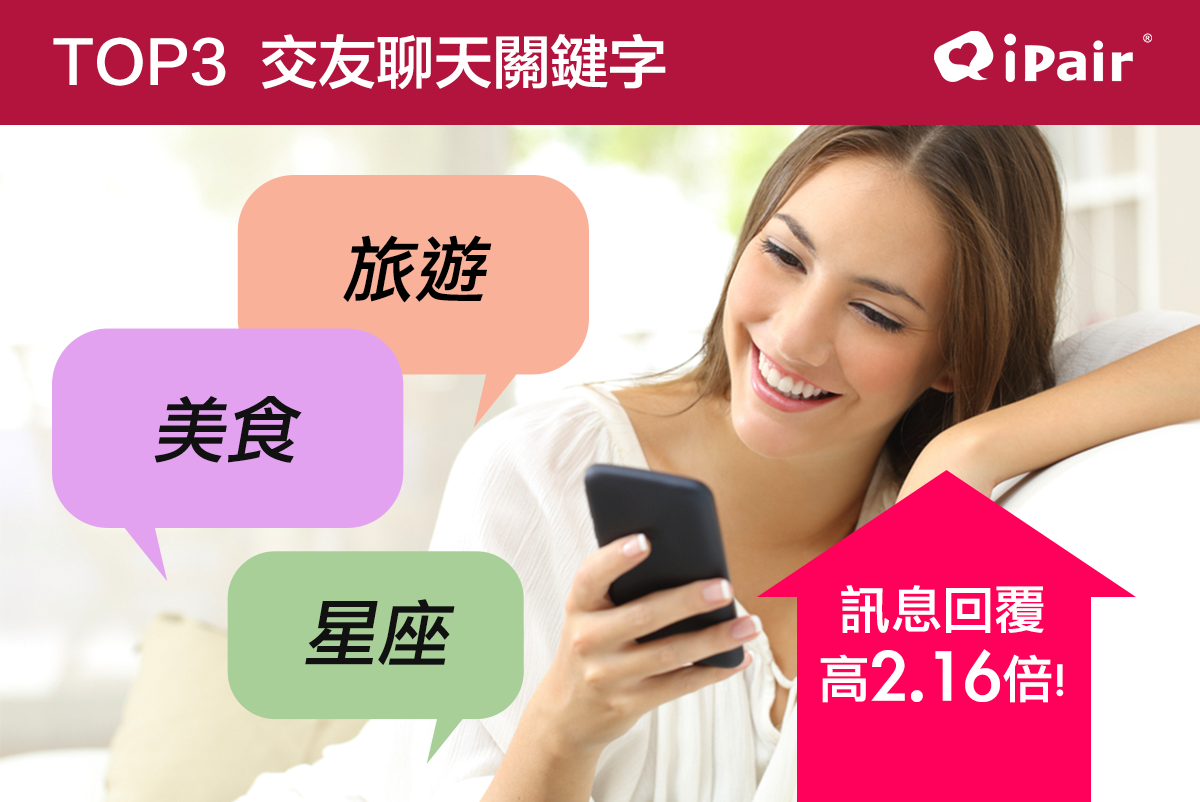 聊天總被已讀不回嗎?根據《iPair》交友直播 App 的調查發現,相較一般訊息的聊天功能,「直播交友」即時互動的特性,更能提高約會的成功率。數據顯示,每5個男生中就有1個因透過直播結識網友,且透過直播互動加溫,平均15.5天就約出心儀對象!不敢透過鏡頭展現自已也沒關係,話題開對就可以!根據調查,若丟出的訊息中提到「旅遊」、「美食」、「星座」這三項關鍵字,回覆率能大幅提升2.16倍!而面對台北人,話題選音樂、電影就沒錯,中部人則要聊星座、南部人愛聊美食、東部則對旅行話題特感興趣。