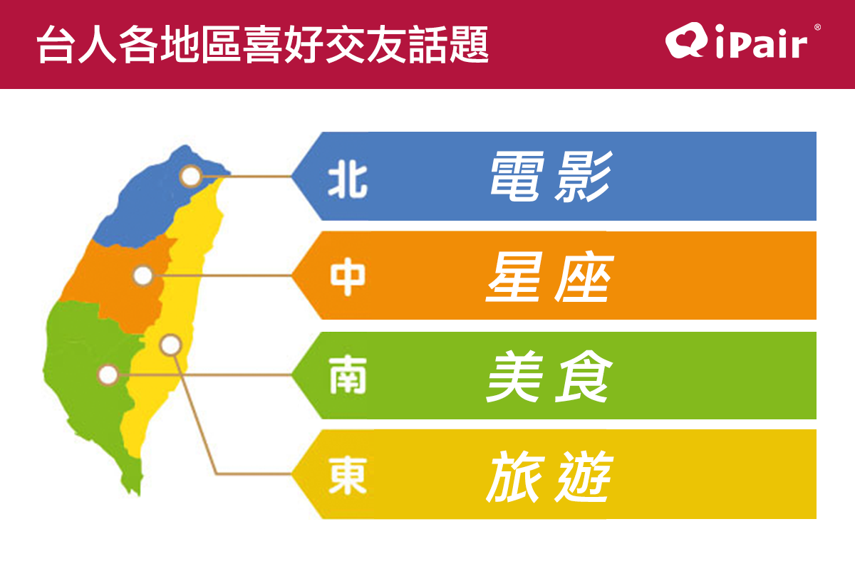 除了透過直播大方展現自我吸引好感對象注意,會不會聊天也是交友重點之一!《iPair》交友直播 App調查時就發現,台人使用交友軟體時最擔心被「已讀不回」、最討厭被「查戶口」。根據調查,相較一般打招呼的訊息,若第一句話中包含「旅遊」、「美食」、「星座」這三項關鍵字,訊息回覆率能提升2.16倍!而隨著不同地區,對於聊天的主題也各有所好。台北人偏愛藝術類的主題,像是音樂、電影,台中人則只對星座話題感興趣,而南部人只要講到美食就會欲罷不能,東部的人則是最無法抗拒旅行話題。還在等對方回應?不妨就從這些話題下手吧!
