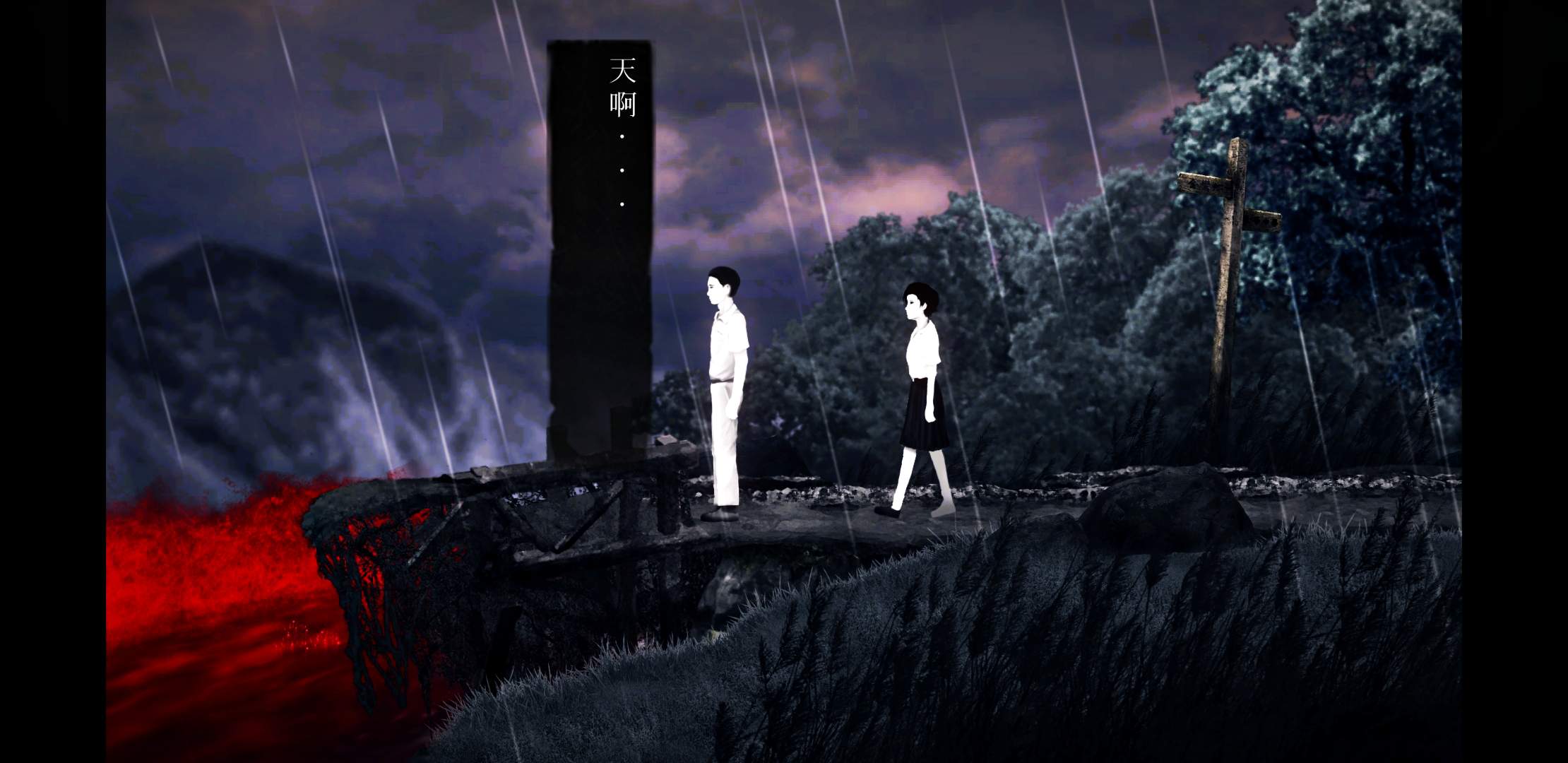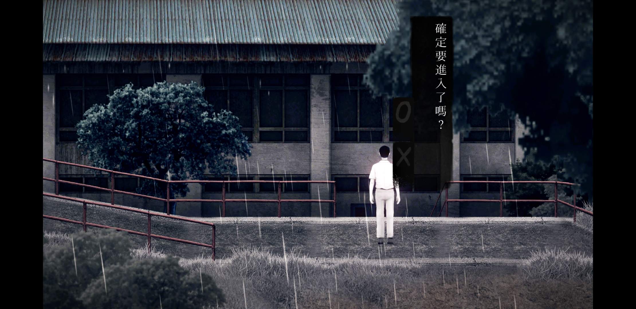 找到項鍊之後,就算是開始進入「正式劇情」。魏仲廷、方芮欣一同來到校門卻發現河水變成可怕的血紅色,通往外面的橋樑也斷了,於是兩人決定回到教室,想辦法度過這個颱風夜⋯⋯接著,遊戲視角會轉變成方芮欣的視角。