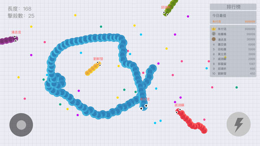 經典遊戲《貪食蛇》是許多人的童年回憶之一,這款遊戲的畫風可愛,不過玩起來卻是有點腹黑。遊戲玩法非常簡單,只需控制這條蛇讓他一直吃就行了(XD)。但要小心碰到其他貪食蛇的頭,不然就會死掉!還可以設計對手,吸收他的能量。還可以幫蛇換造型呦!