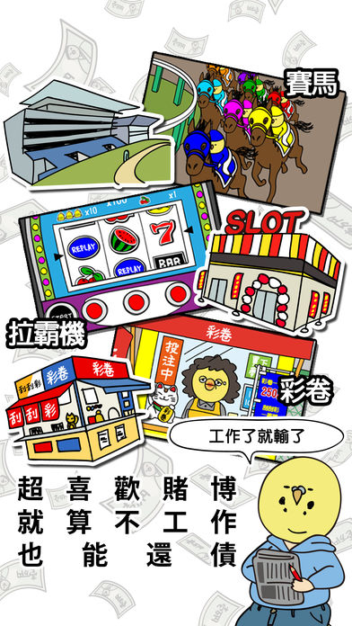 玩家在遊戲中將化身為沈迷賭博,向地下錢莊借錢而被追債的主角,為了還錢,他決定靠著賭博來還債。遊戲中的賭博有賽馬、拉霸機、彩券三種,在這裡將能體驗賭徒的內心想法,賭性越堅強,在還債的過程中樂趣也會越多,但同時也是種惡性循環⋯⋯雖然玩起來很舒壓,但遊玩時還是不要太過投入呀!