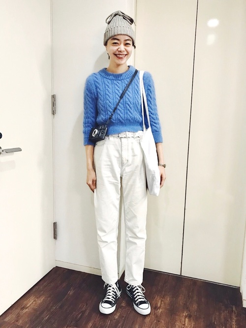 藍色短版毛衣搭配白色高腰直筒褲,顏色和剪裁設計減低毛衣的厚重感,看起來很修身也很清爽唷~