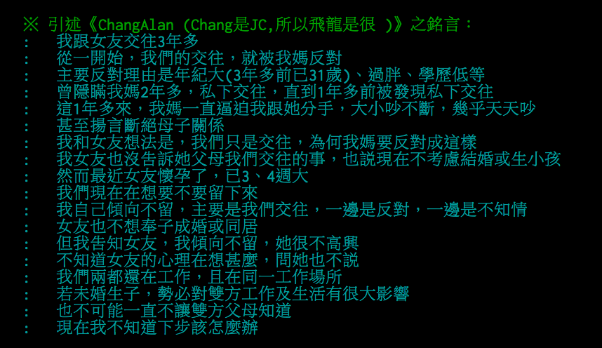 原文:「我跟女友交往3年多。從一開始,我們的交往,就被我媽反對。主要反對理由是年紀大(3年多前已31歲)、過胖、學歷低等。曾隱瞞我媽2年多,私下交往,直到1年多前被發現私下交往。
