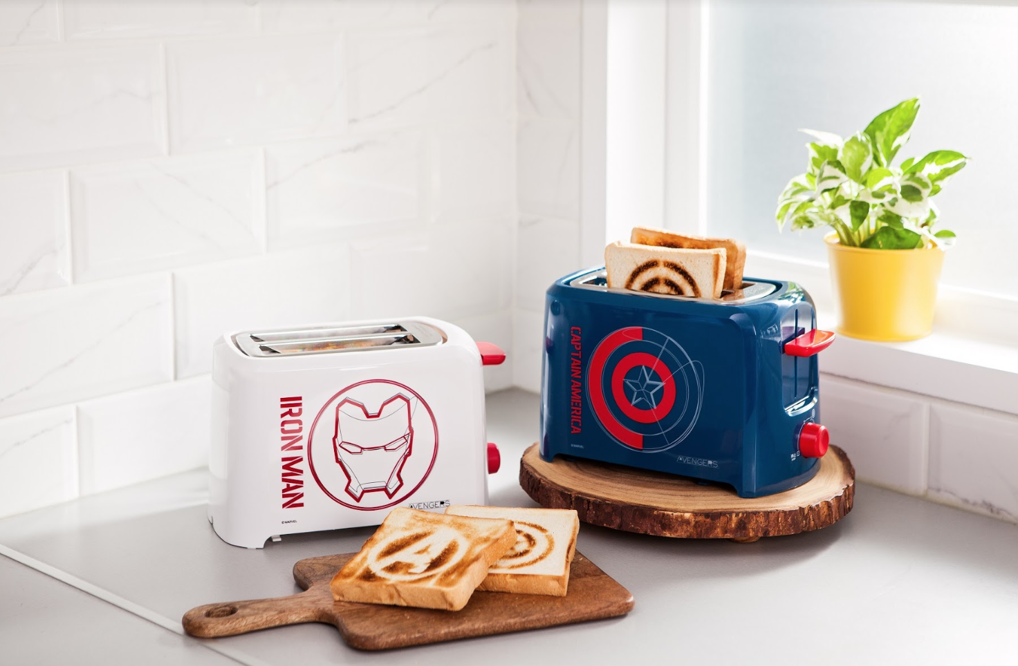 外殼不僅有英雄圖騰設計,最吸引人的是麵包機竟然能烤出鋼鐵人及美國隊長的雙面圖案!另外他的烘烤控制旋鈕也包含了1到5段的烘烤