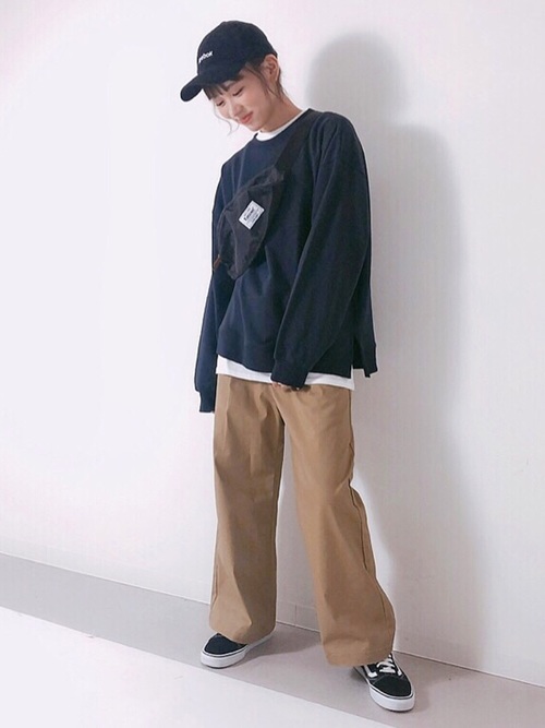 想要來點中性打扮不妨跟著上圖女孩一起穿!深藍色開衩毛衣配上褐色工裝褲,再內搭一件白色薄T恤營造雙層次感,鴨舌帽與胸揹包絕對是街頭穿搭不可少的配件,率性中又帶點甜美Fu,這週來點不一樣的風格打扮吧!
