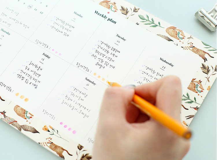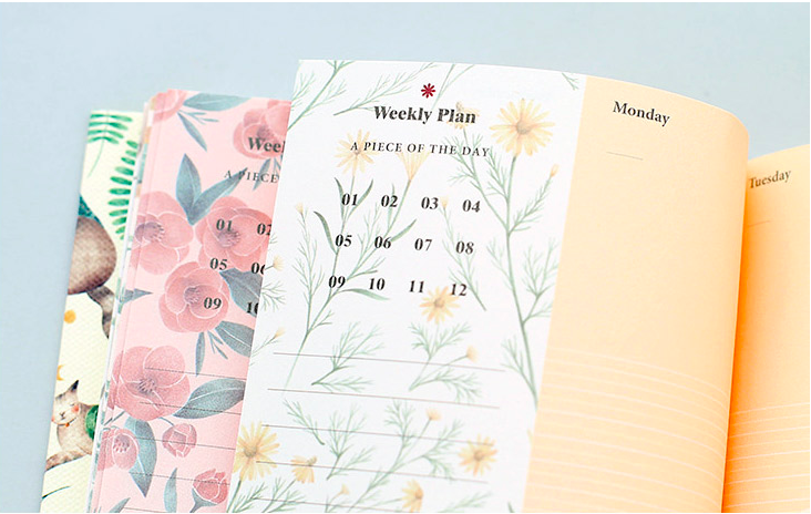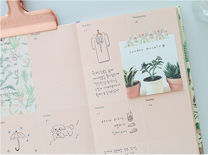 小清新而簡約的外型,讓眼神停留在週計劃本上面的每一刻都覺得好放鬆!自填日期的設計真的相當方便,如果突然懶得規劃(?)或者遇到比較空閒的一週,就算沒有使用也不會過期。而且還可以撕下來貼在書桌前的牆上,營造韓妞氛圍♡