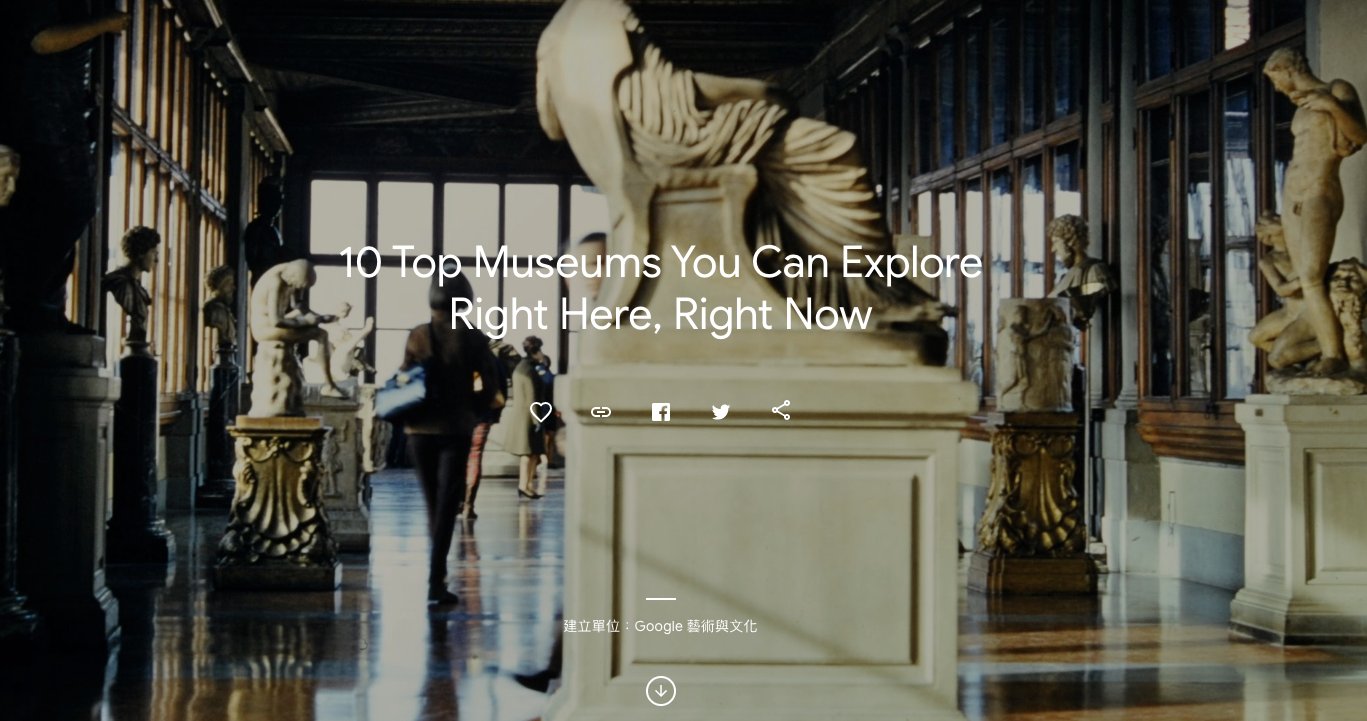 雖然台灣的疫情已經管控的還不錯,零確診也連續出現了好幾天!但大家還是小心為妙,不要出門人擠人啦~用Google也能探索台灣的博物館啦!目前的展出內容有高雄的佛光山佛陀紀念館、台灣國立故宮博物院、富邦藝術基金會 及 國立自然科學博物館等等,台灣的展出內容有超過1000件藝術品、