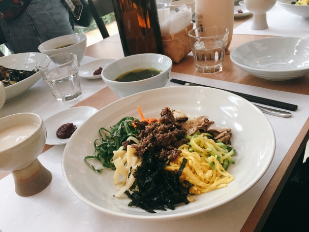 位在F1963的福順導家,擁有被稱為是「米酒界終結王的馬格利」,濃度約6.5%,售價18000韓幣,跟一般的馬格利不太一樣,略帶一點氣泡感,喝起來很順口,福順導家在餐前還會提供小菜以及海帶湯,主菜我們選的是「韓式牛肉拌飯」,辣醬另外分開,不敢吃辣的妞妞們可以自行決定加入份量,記得享受之前,一定要攪拌均勻,這樣一口才可以同時吃到牛肉以及飯菜!