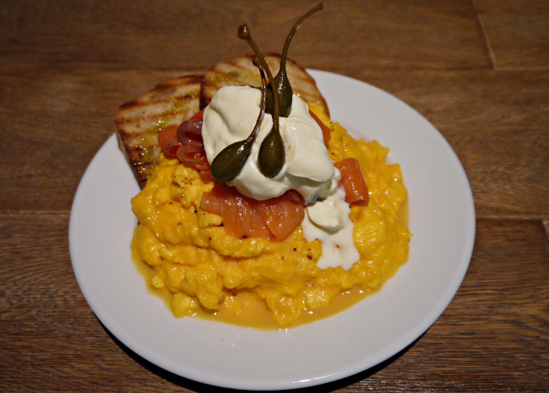 在這之中,推薦早餐與午餐時段相當有人氣的法式炒蛋來品嚐,法式炒蛋有分生火腿、鮭魚、羊奶起司跟蕃茄乾三種口味。綿密滑順的法式炒蛋,搭配油脂飽滿的鮭魚,上面再點綴希臘酸奶跟酸豆,以及附上烤得恰到好處的吐司,搭配在一起食用相當滿足。