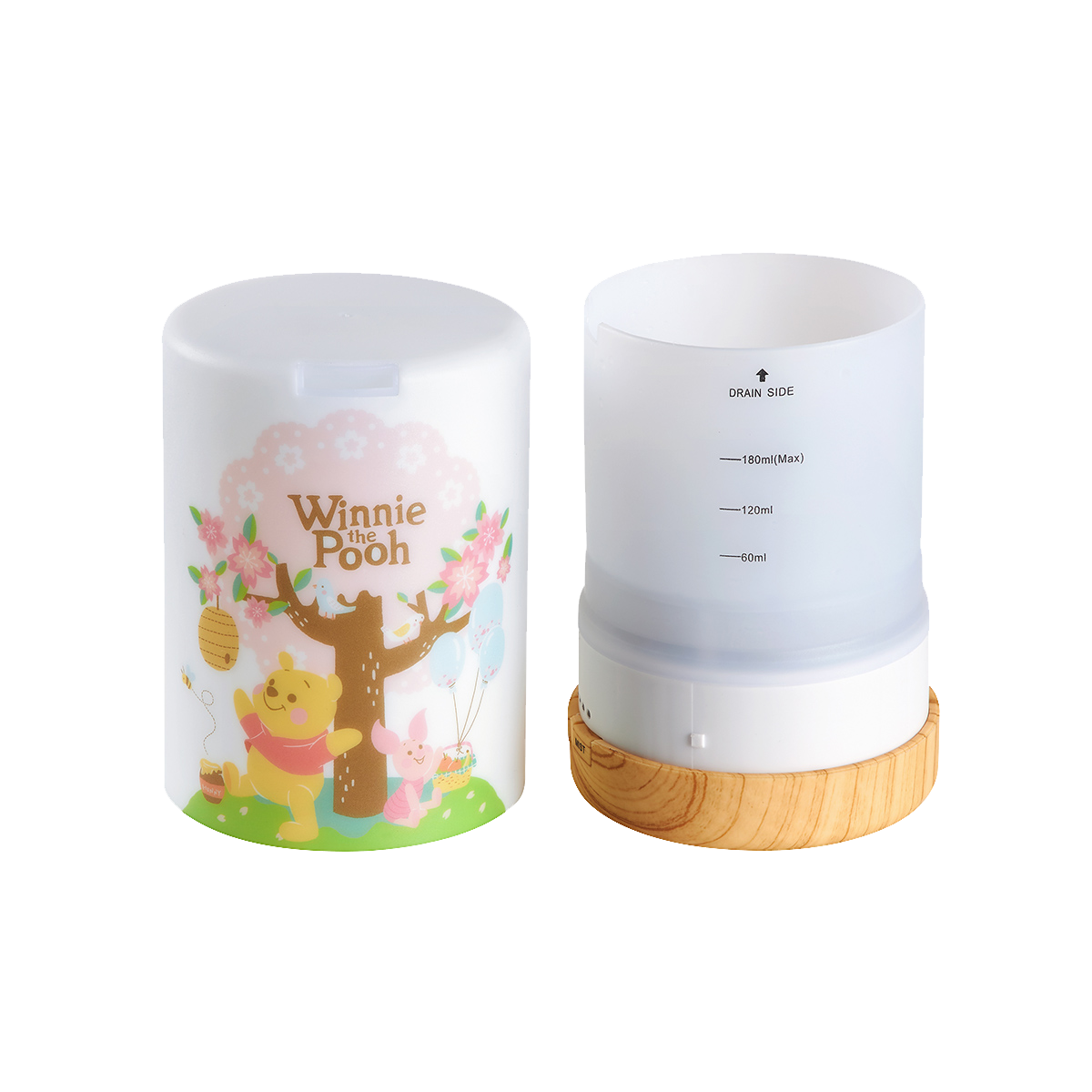 散發甜蜜氣息的香氛水氧機以在櫻花樹下玩樂的小熊維尼&小豬為圖案,除了能作為香氛加濕器使用之外,在夜晚還可當作夜燈使用,可依個人喜好調整亮度,讓小熊維尼日日夜夜陪著你~