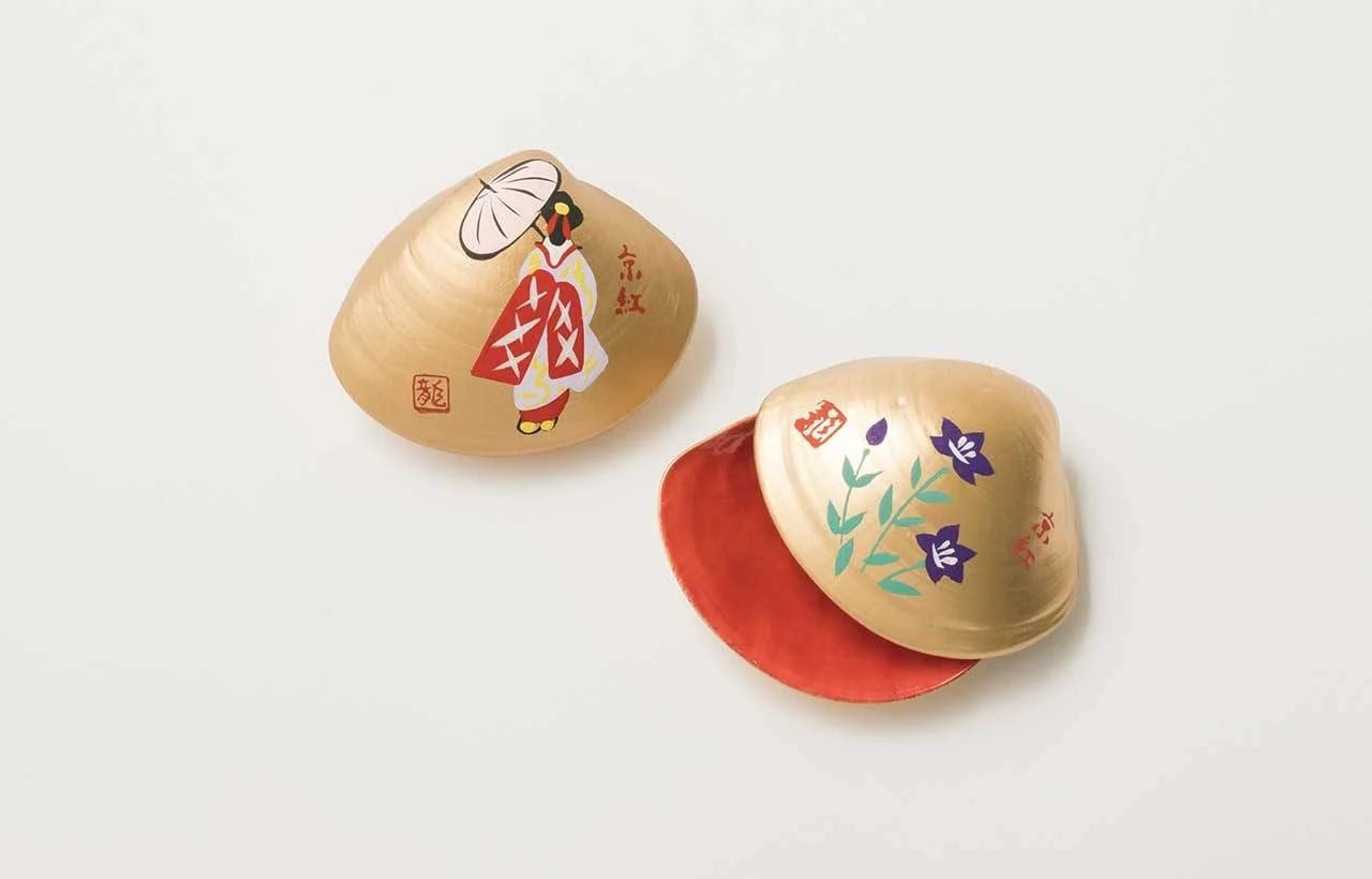 用紅花所提煉的紅液,塗抹於蛤貝內側所製成的日本傳統口紅,至今仍受到不少舞妓們的愛用與支持。使用時用唇筆或手指沾水塗抹。蛤貝的外側繪有日本傳統圖案,內側兩面都是鮮豔的朱紅色。各1,000日圓。