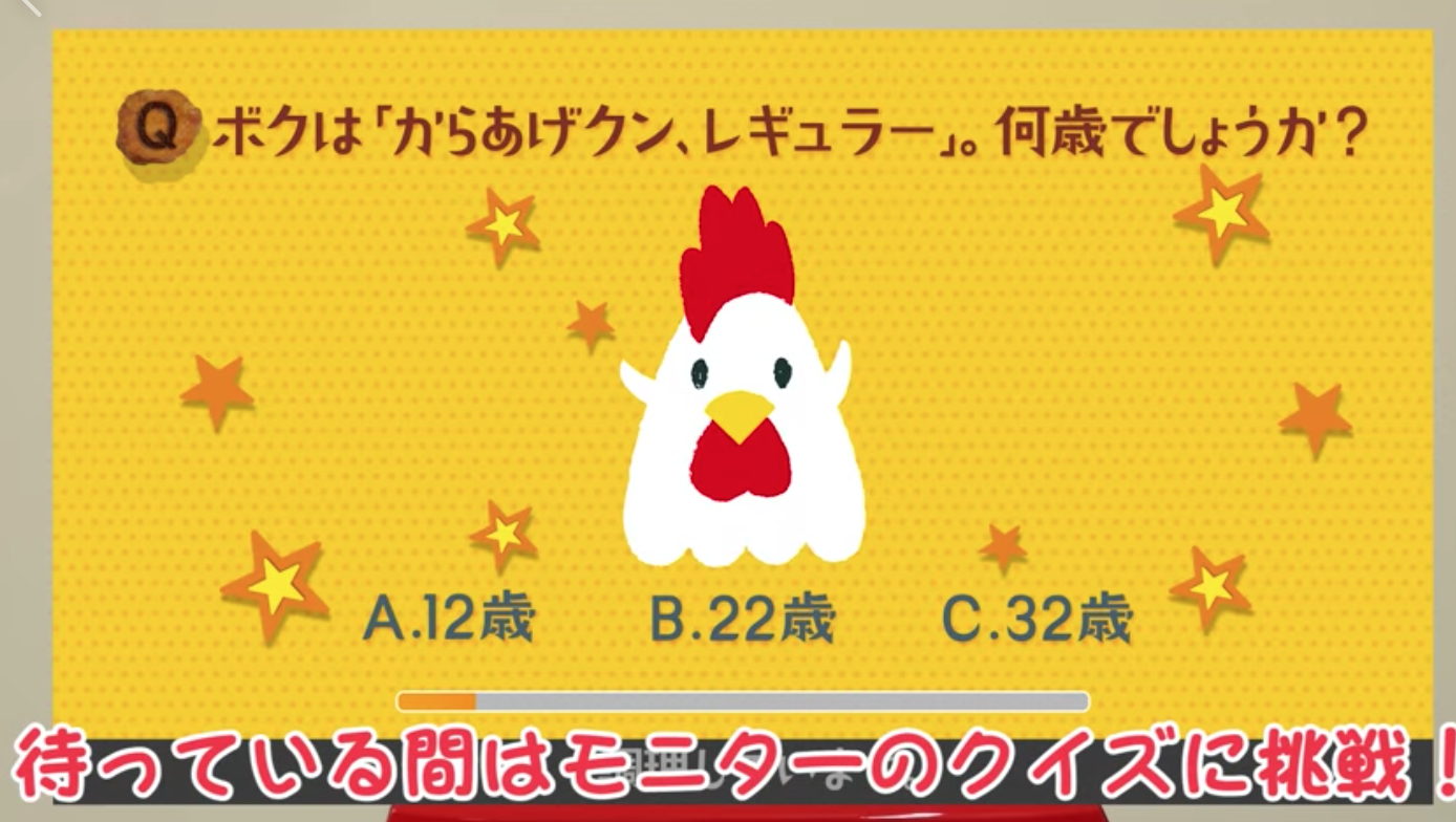 機器的外型就是小雞的樣子,十分可愛~使用方式也非常簡單,首先先跟店員購買裝雞塊的紙盒,放入炸雞機台內然後按下開始就可以了~在等待期間還有一些問答遊戲可以玩,是不是很貼心XD