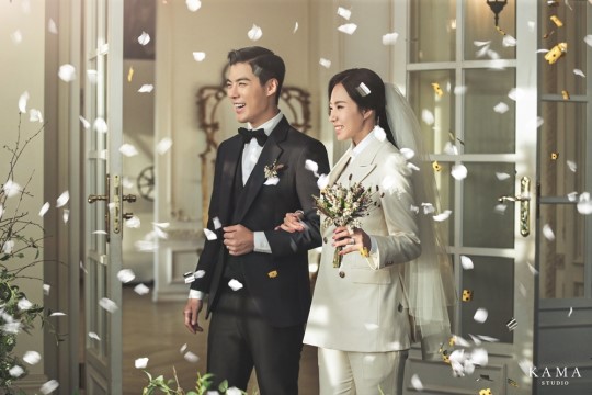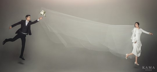 結婚典禮當天走古典氣質路線的李相花,前不久釋出的婚紗照更彰顯出他的獨特品味,選擇純白禮服、上面鑲上立體黑花的吸睛款式,經典之中玩出不同個性,另一套則換上佈滿閃耀珍珠的性感禮服,戴上珠寶頭飾,大走皇室公主的內斂華麗風。(追妻照也超幽默,很康男XD)