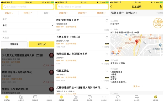 上大學就是會變得很拮据,要買原文書、要吃飯、要跑活動等,有各種花錢如流水的事。因此,打工也是上大學的必修學分,用《小雞上工》這款App找打工機會非常便利,可以選擇自己要的時段、地區來搜尋。點進店家後就可以看到店家的各種資訊,包括地址、聯絡方式、工作內容以及薪資等。