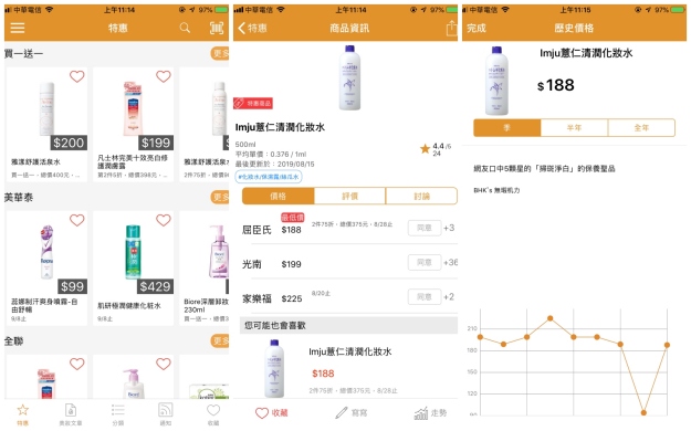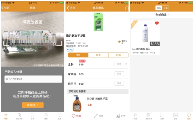 這款App還有提供掃條碼搜尋商品的功能,這個功能超方便,輕輕掃一下就會出現資訊。另外也可以把自己常用的商品加入收藏清單,並且設定提醒,這樣的話有任何活動或是打折的資訊,就可以即時接收到訊息,是省小錢的好幫手!