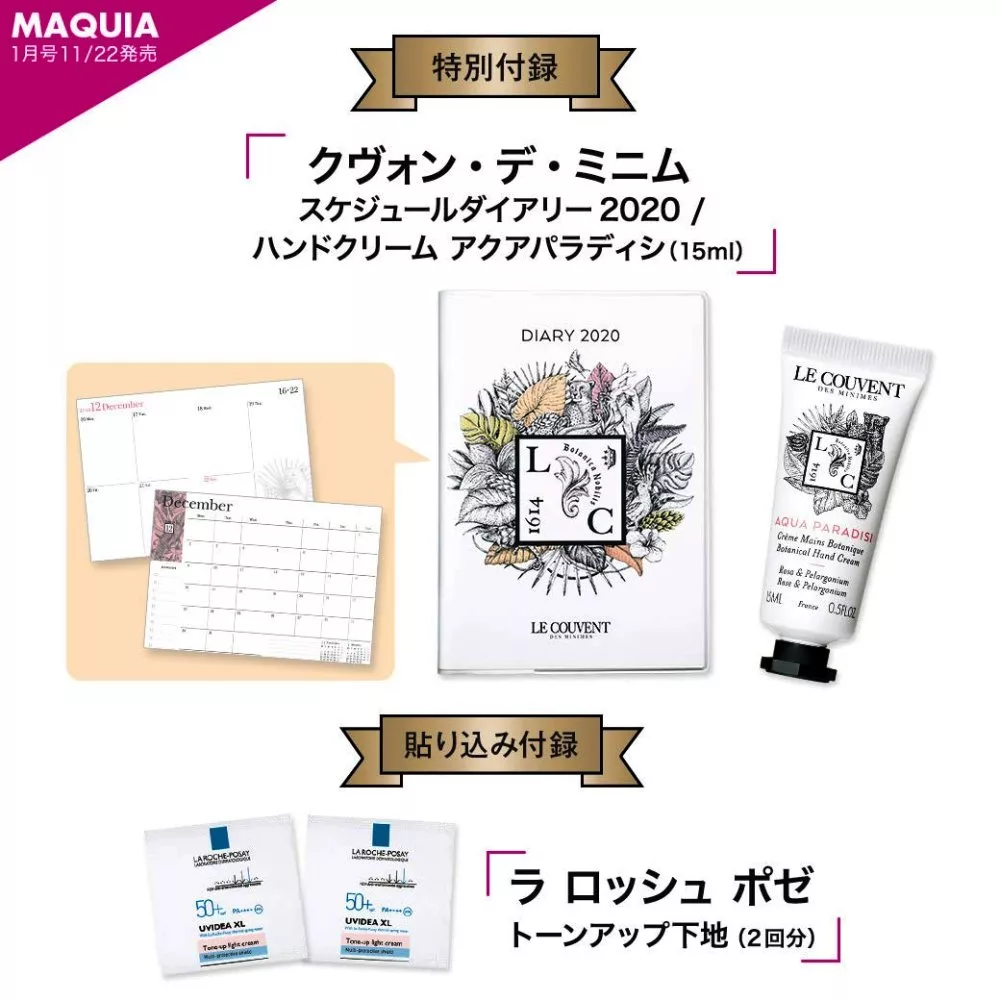 每期都收錄豐富的彩妝資訊與護膚祕訣的《MAQUIA》,1月號要附贈的是法國香氛品牌Le Couvent des Minimes洛蔻芳的護手霜和2020年月曆手帳。除了外在的保養之外,內在也要積極充實,不妨用手帳來為2020年設定目標吧!