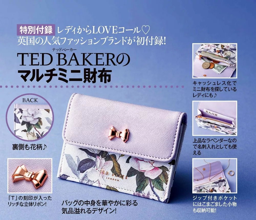 而這個月的《美人百花》附錄同樣也令人少女心爆發,來自英國的人氣品牌TED BAKER「迷你錢包」,優雅的粉紫色與花卉點綴,立體的玫瑰金蝴蝶結與防刮皮革材質,其質感已經無法用言語形容了啦~《美人百花》已經榮登妞編心中1月必買的日雜啦!