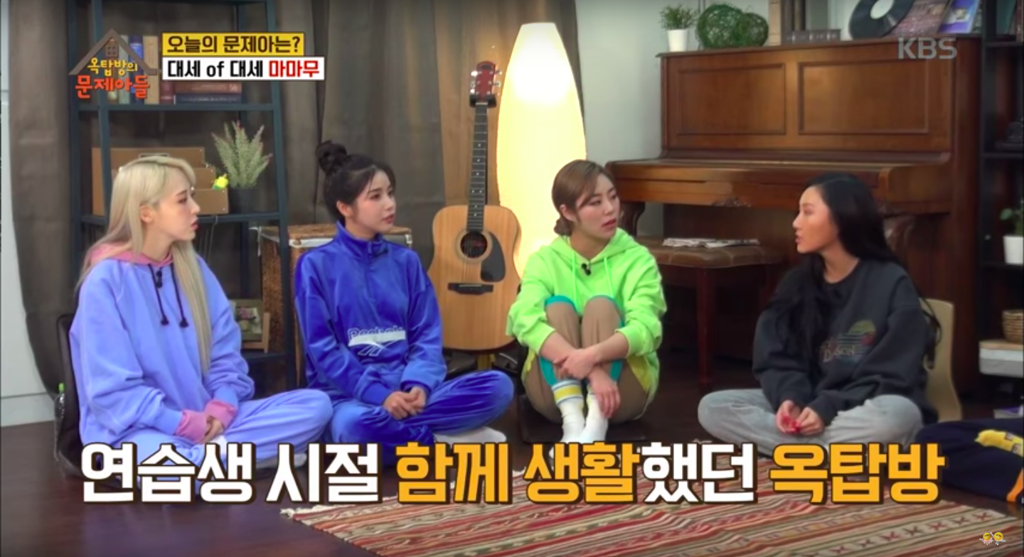 MAMAMOO成員頌樂、玟星、輝人及華莎合體出演韓綜《屋塔房的問題兒童們》,在昨天播出的內容中,首度公開出他們出道前的苦日子!成員首先自嘲自己是最適合此節目的嘉賓,因為他們曾一起在閣樓中生活了2到3年,不只夏天更熱、冬天更冷,當MC「鄭亨敦」提到閣樓裡會有超多蟑螂出沒的時候,成員們都超有同感狂點頭~