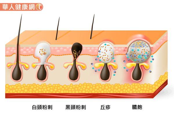 而俗稱的青春痘、痘痘,其實在醫學上的正式名稱是「痤瘡」,其成因與皮脂、角質過度分泌,及髒污阻塞毛孔形成粉刺,引發細菌感染,造成毛囊發炎有關。且痘痘根據發炎程度的不同,由輕至重可分為:未發炎的白/黑頭粉刺,以及發炎後的紅色丘疹,和化膿呈現白色突起的膿皰。