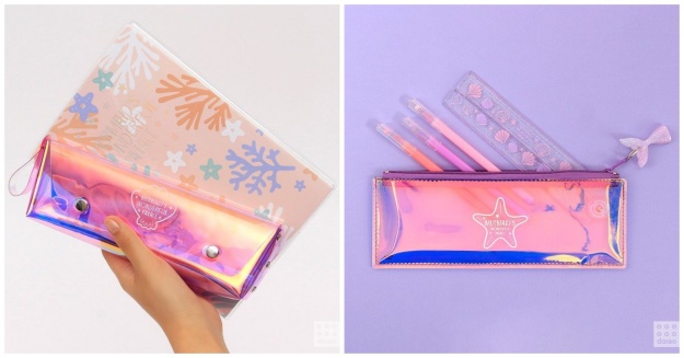筆袋則是走霓虹風格,搭配海星、貝殼等LOGO,另外還有貝殼圖案的折疊尺,直接幫你湊好一整組美人魚文具。(笑)