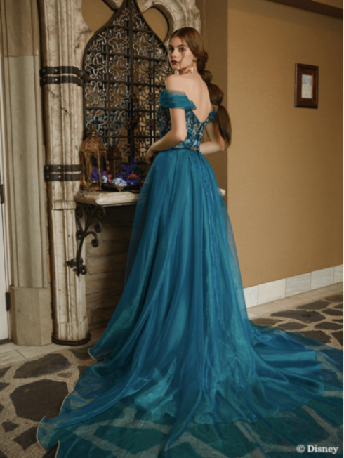 最後就是現在好評不斷熱映中的《阿拉丁》茉莉公主,妞編輯個人私心覺得茉莉公主的服裝在動畫中就很時髦,這套茉莉公主的婚紗整體以異國感十足的藍綠色為主,上身搭配串珠亮片刺繡、雙肩以同色系薄紗作為落肩袖口,搭配鑲金邊落地紗裙,展現茉莉公主的個性氣勢!