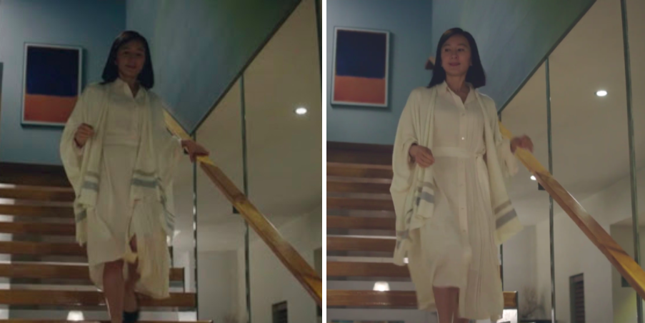為了隨時切換副院長醫生以及親子(媽咪)角色,「襯衫」以及「窄裙」出鏡率超高,可以披上白袍立刻開啟上班模式,下班接兒子也能立刻轉換,當然池善雨不論下班身單品或是外套都大多選擇多層次的長版單品,加上腰帶顯出腰身,無疑是保守不失優雅的40代優秀女性範本穿搭。
