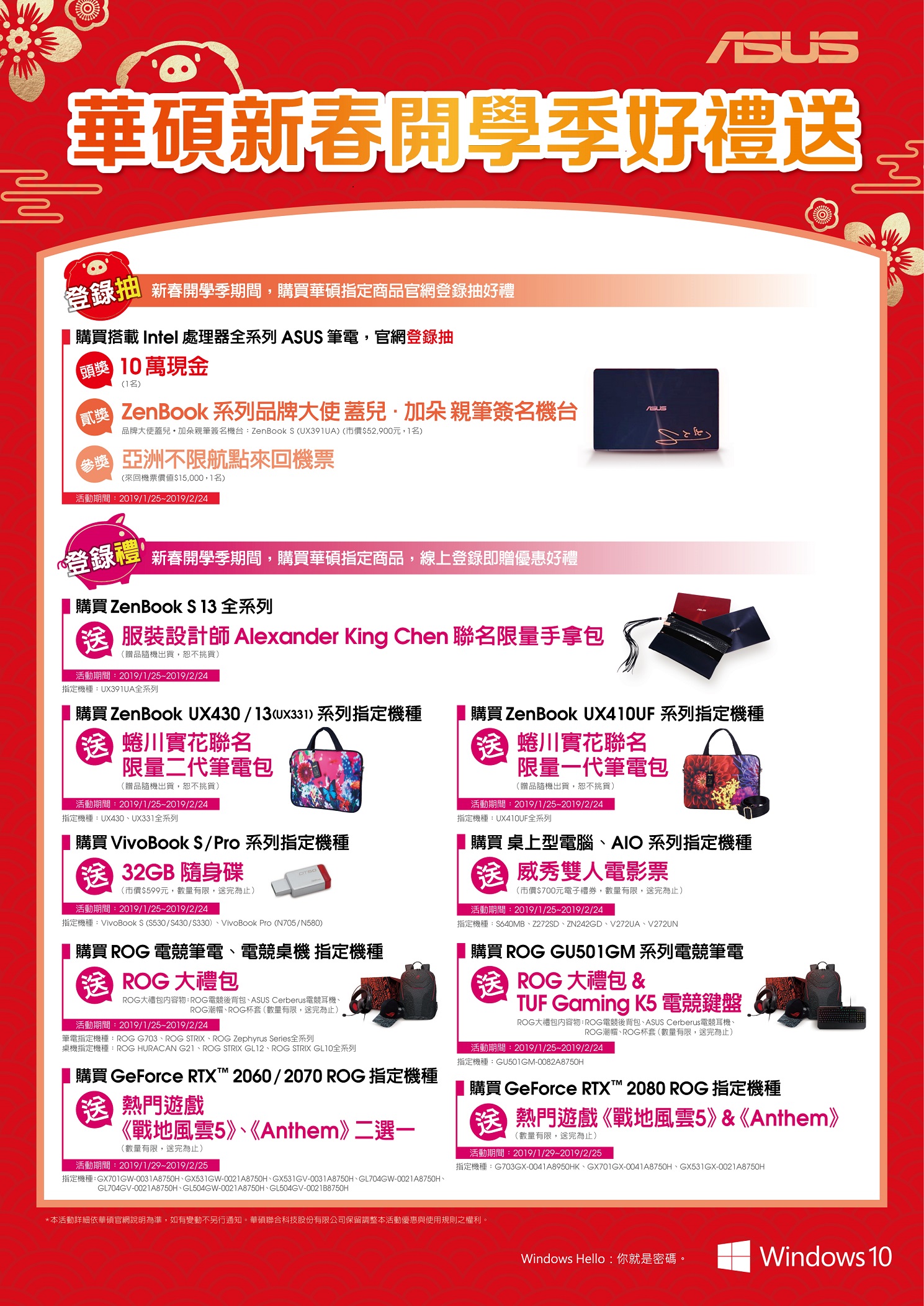 至於登錄禮部分則包括:ASUS VivoBook系列指定機種,送「32GB隨身碟」(市價NT$ 599元);ASUS ZenBook系列指定機種,贈「Alexander King Chen限量聯名手拿包」或「蜷川實花聯名限量筆電包」;ASUS S640MB系列桌上型電腦及ASUS Zen AiO / Vivo AiO指定機種,送「威秀雙人電影票(市價NT$ 700)」;此外,還有ROG玩家共和國搭載GeForce RTX™ 2080顯示卡指定電競筆電,贈《戰地風雲5》與《冒險聖歌Anthem》遊戲序號;指定電競筆電/桌機,送「ROG大禮包」(內含:ROG電競後背包、ASUS Cerberus電競耳麥、ROG潮帽、ROG杯套),其中ROG GU501GM指定機種,另加碼贈「ASUS TUF Gaming K5電競鍵盤 (NT$ 1,790 )」; 更多活動詳情及最新消息,請參閱:https://www.asus.com/tw/events/。
