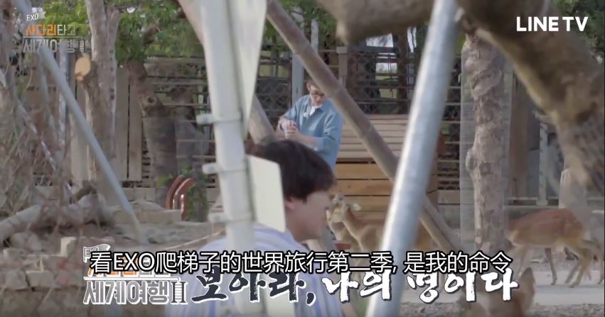 後來《EXO的爬梯子世界旅行》預告片中真的出現了EXO團員們在「鹿境」餵鹿的畫面,一群小鹿跟著食物走真的好萌,帥哥加上可愛小鹿是個很完美的搭配!(XD)