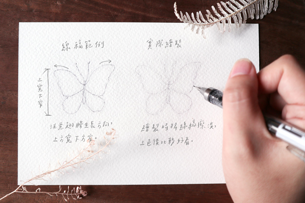 仔細觀察蝴蝶的型態,翅膀為上寬下窄,注意翅膀的弧度,可以先在筆記本上練習畫出蝴蝶的姿態,實際繪製到水彩紙上時,記得將線稿擦淡如右圖所示,上色後會比較好看。