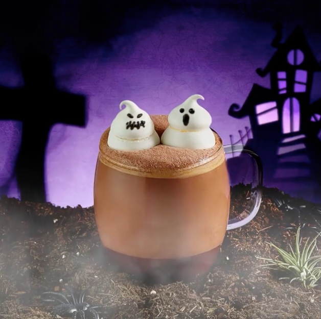 「你是生氣還是害怕啊!」未知的小鬼魂出現在星巴克了,這款「跳舞幽靈巧克力」結合了雙份濃縮和黑巧克力的混合,在甜苦的摩卡上方還有幽靈棉花糖!(P.S.棉花糖表情隨機出)