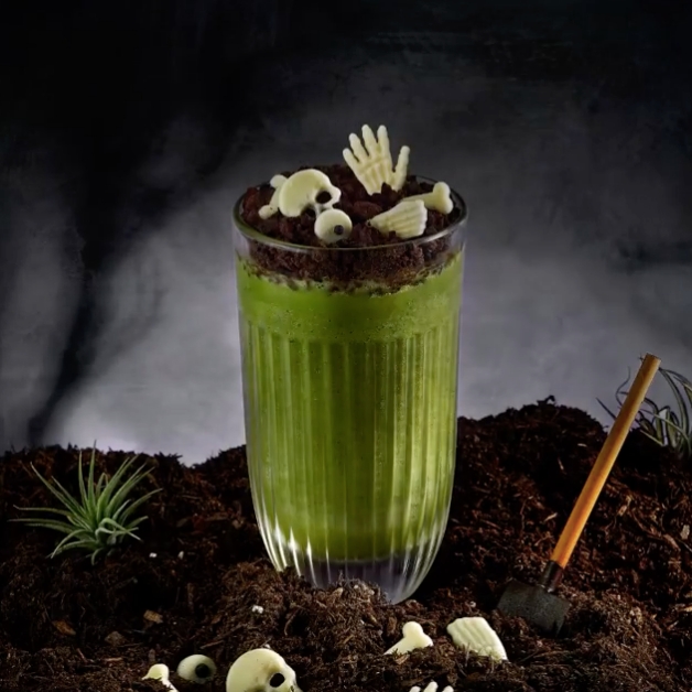 韓國星巴克號稱喝下這杯「古墓星冰樂」,第一次衝擊是來自於世界上最新的視覺效果,第二次衝擊則是世界上最美味的味覺口感,古墓正式開放給妞妞們壯膽。綠茶基底的星冰樂,撒上有如墳土般的巧克力,再加入骨頭形狀的巧克力,感覺令人毛骨悚然,還會附贈斧頭和鏟子餅乾喔!(P.S.白巧克力骨頭造型隨機出)