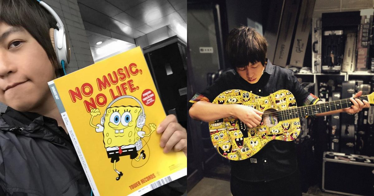 阿信對海綿寶寶愛太深了,手上拿的雜誌是海綿寶寶,甚至還神還原海綿寶寶的耳機造型,連手上抱的吉他都是海綿寶寶的滿版圖案,這個黃色小方塊真的太幸福了!