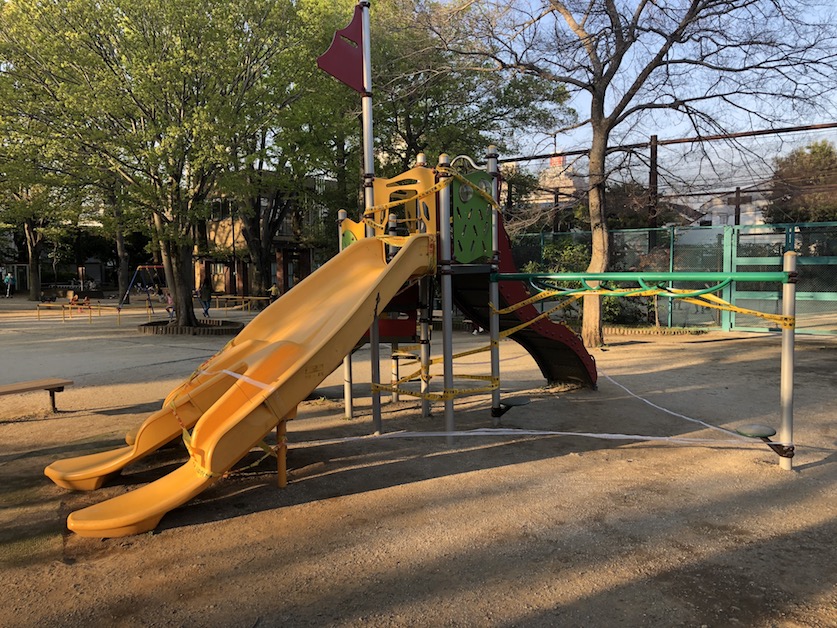 平時充滿大人談天、小孩嬉鬧的午後公園,在疫情影響下因為不能出遠門反而聚集更多人潮。針對保持社交距離此事,日本政府開始拉起封鎖線,禁止小孩靠近遊樂設施,降低病毒傳染的可能性。